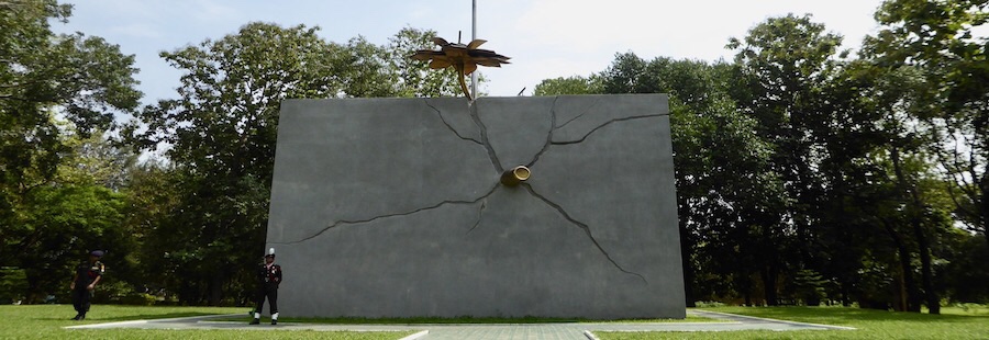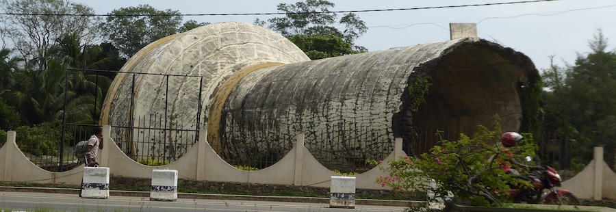 The first stop on my tour of the north with Damith was the War Memorial in Kilinochchi. Set in manicured grounds it is a huge concrete block topped by a lotus flower and pierced by a shell.