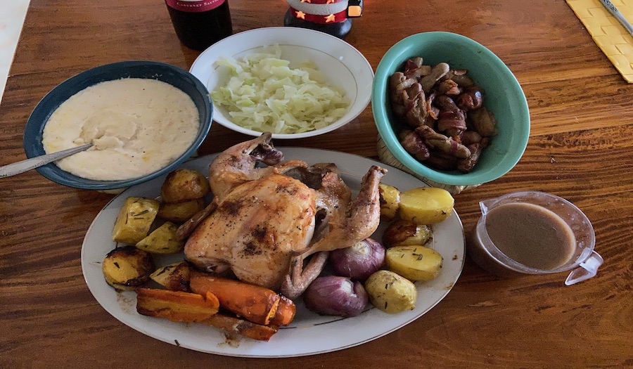 I didn’t attempt to compete with this, instead I did a version of an English Christmas dinner for a few Sri Lankan friends. A roast chicken with a cashew nut stuffing was the centre piece with rosemary roasted potatoes. The ‘pigs in blankets’ and bread sauce caused the most interest though.