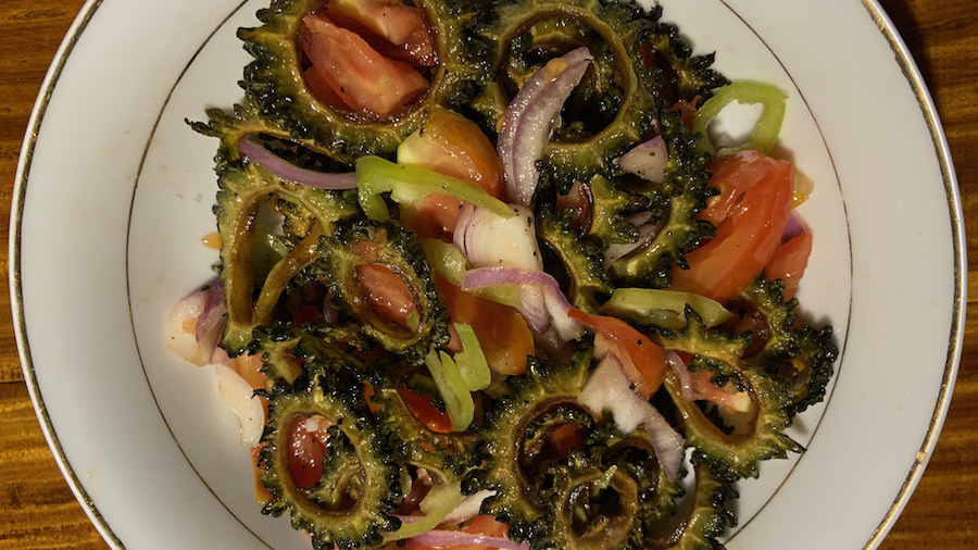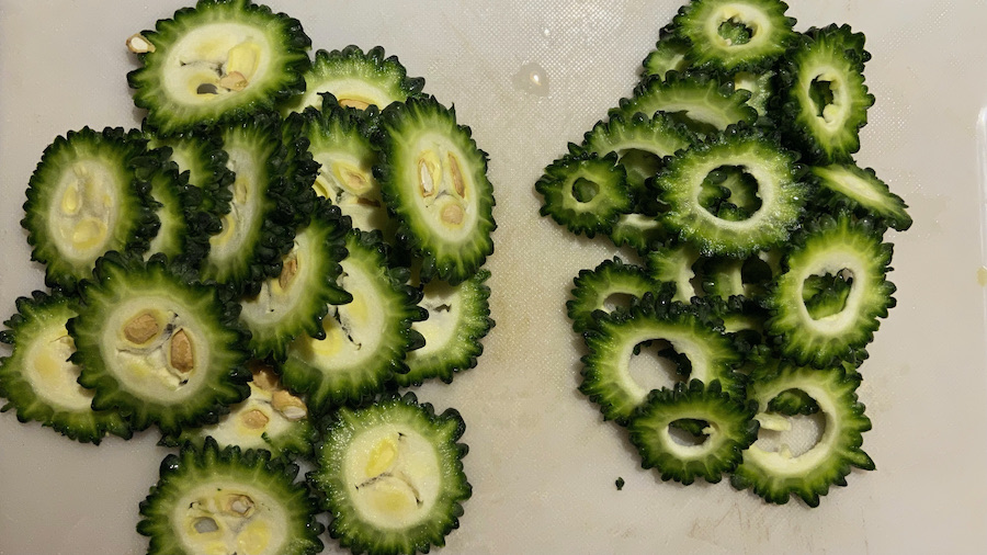 • Wash and slice the bitter gourd finely, push out the seeds and discard