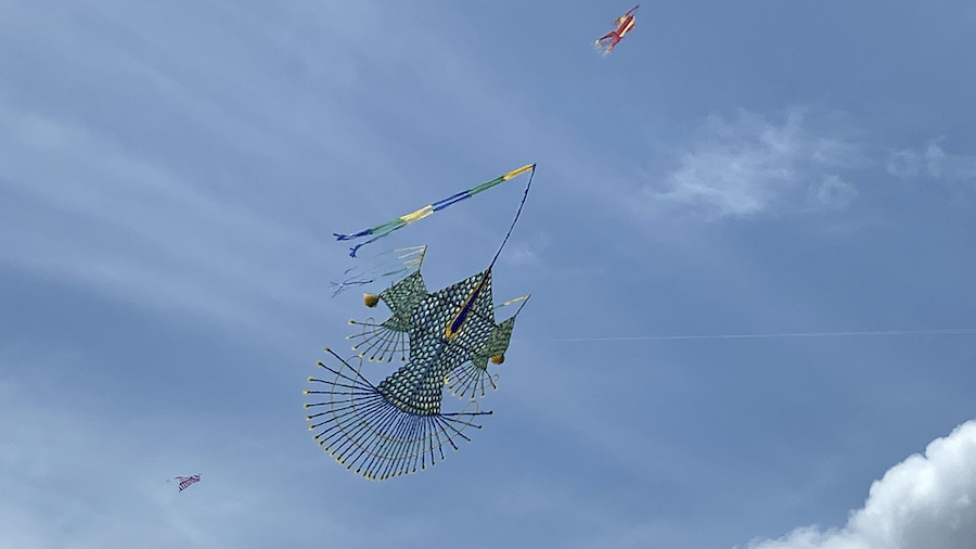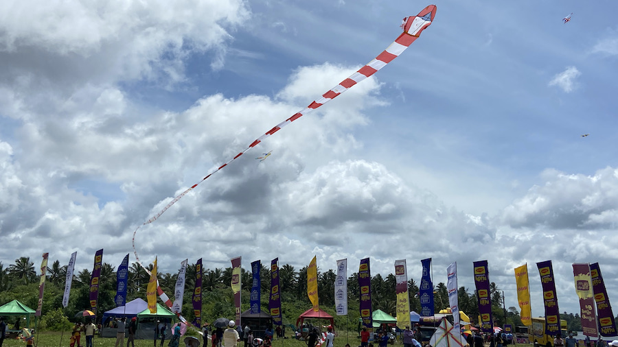 The traditional snakes, fish, peacock and frog kites competed against modern designs. The longest snake kite had a 150 metre tail, and skill need to ensure it didn’t get entangled with other snakes or nearby palm trees.