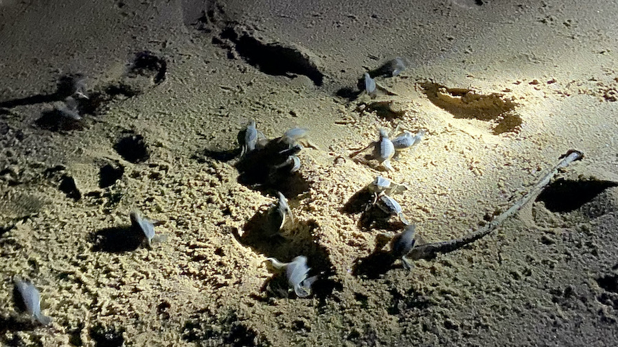 In the meantime, a patrol had located another nest where the eggs were just starting to hatch.  Hundreds of tiny little turtles started to emerge then start their dash across the sand to the sea, and then they were gone too.  A very special memory!