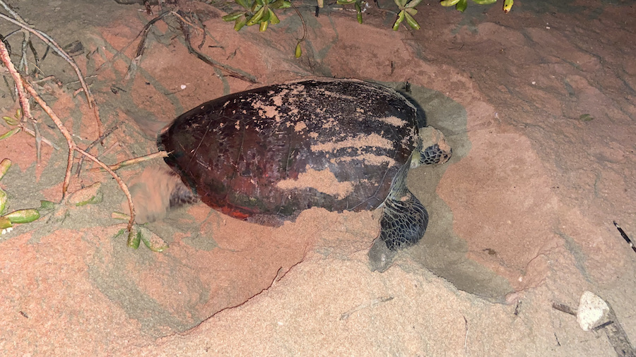 The beach is patrolled every day and night by small teams of volunteers who keep watch to make sure nobody disturbs the female turtles when they come out of the sea and up the beach to make nests and lay their eggs in the soft sand.