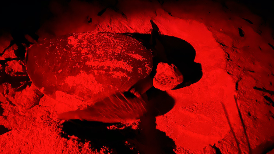 He located a turtle laying her eggs in a nest dug deep into the sand.  For another hour she carefully buried the eggs and hid the site by gradually moving away and moving sand, then she turned and made her way down the beach into the sea and was gone.