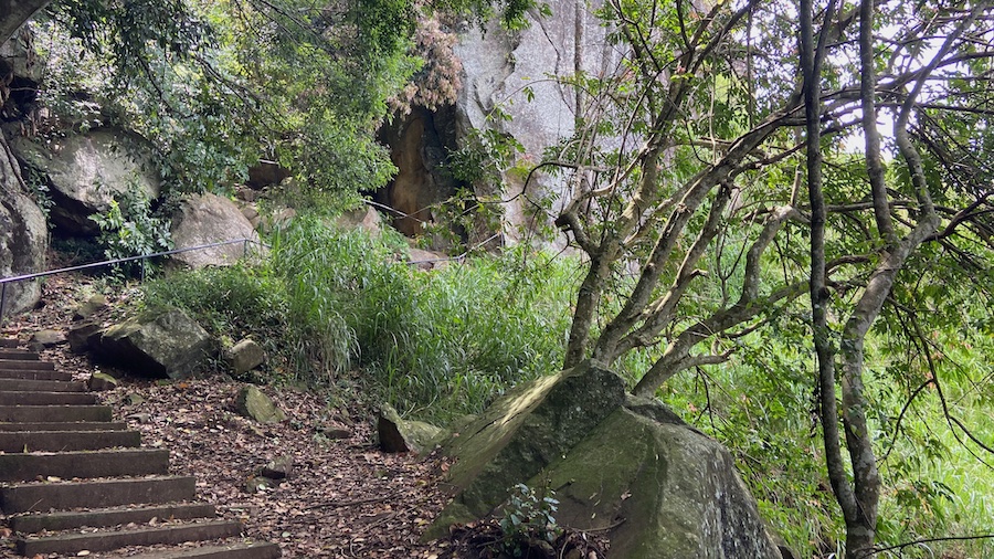 Most of the climb is uneven, concrete steps, some of the way has a handrail.  It’s cool and shady going up beside the rock.