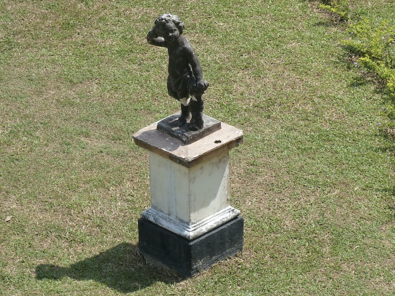 The formal gardens still exist. A forlorn statue of a woman looks away from the house while statues of two small children, one of whom is a boy look towards the house.