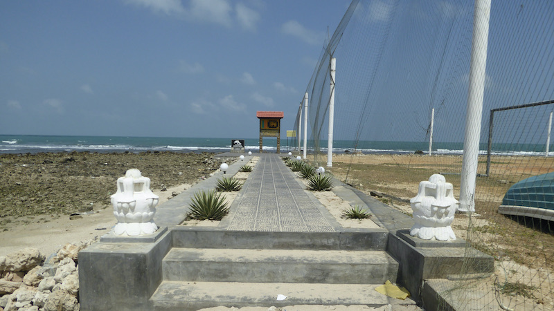 One is a long, narrow isthmus known as Elephant Pass, named for the elephants that were driven through the shallow waters on their way to export. The other is a modern road over a spectacular bridge leading onto an artificial causeway across the Indian Ocean linking the area to Pooneryn.