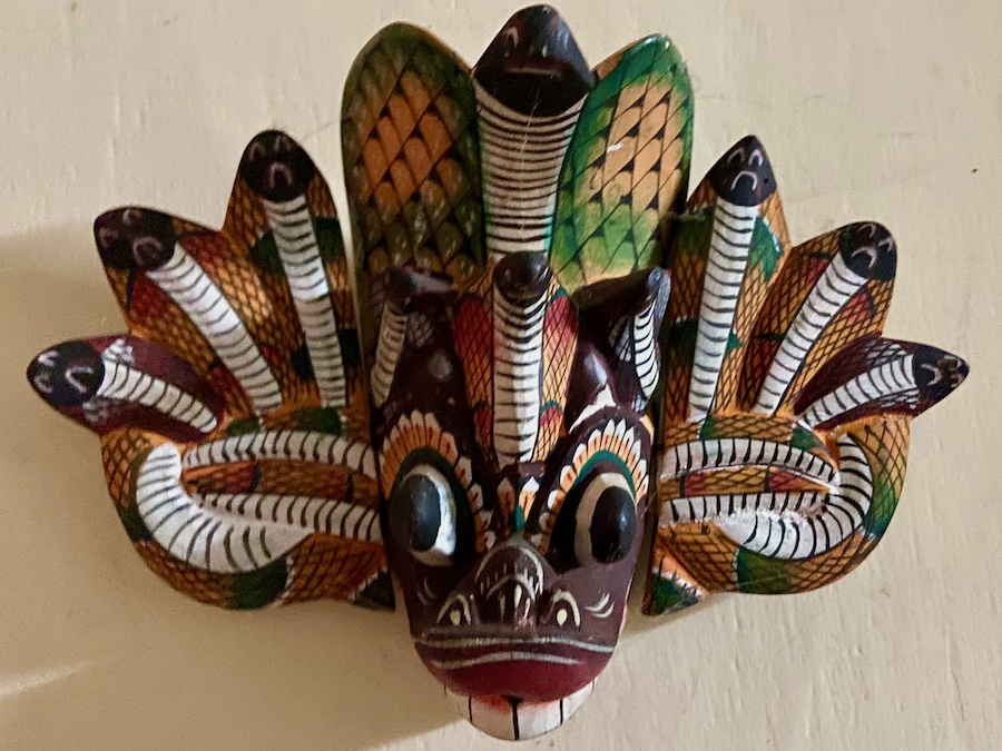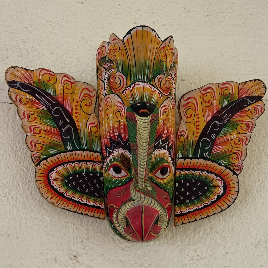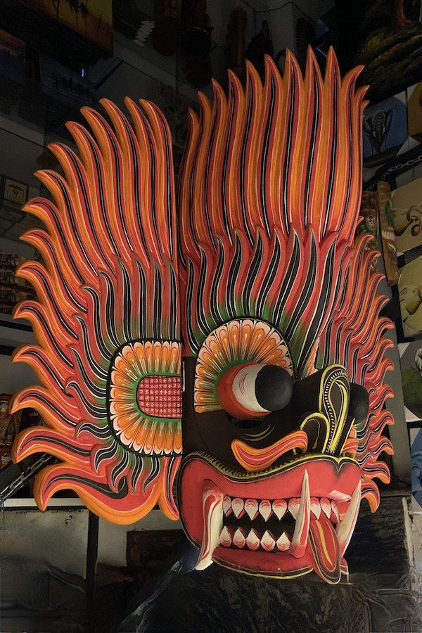 The vibrant, colourful masks on display in many shops have their roots in primitive pre Buddhist beliefs going back more than two thousand years and come from the Rakshasas, a race who ruled Sri Lanka and could assume different forms. Raksha means demon and the masks are intended to ward off evil in a series of rituals and dances. They are painted in vibrant colours with bulging eyes and protruding tongues.