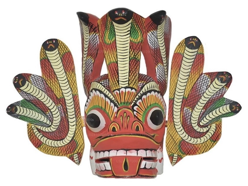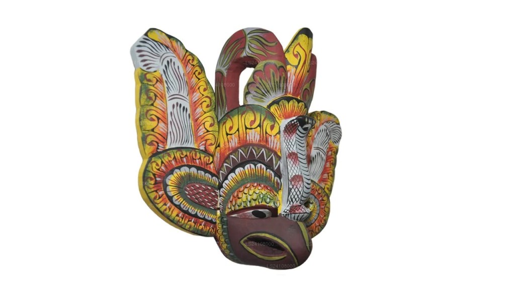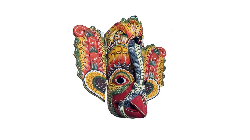 The Gurulu is a mythical solar bird. According to Hindu and Buddhist mythology is was the vehicle on which the Hindu God Vishnu rode. The bird is devouring a snake. The snake above the bird’s face is called Naga and the mask is decorated with enemy snakes. The mask is said to give beauty, power and fame. They can be hung in homes for protection and good luck