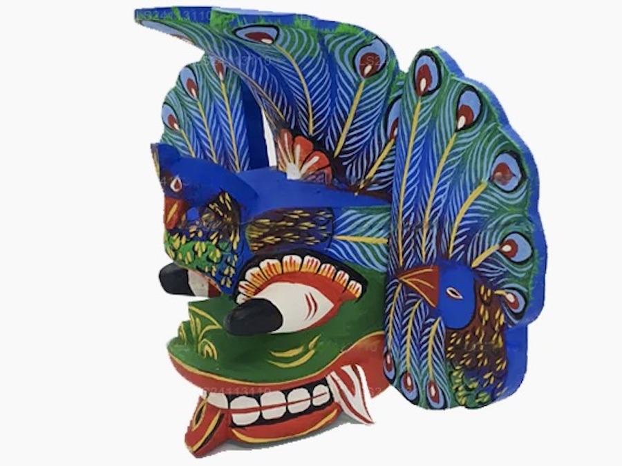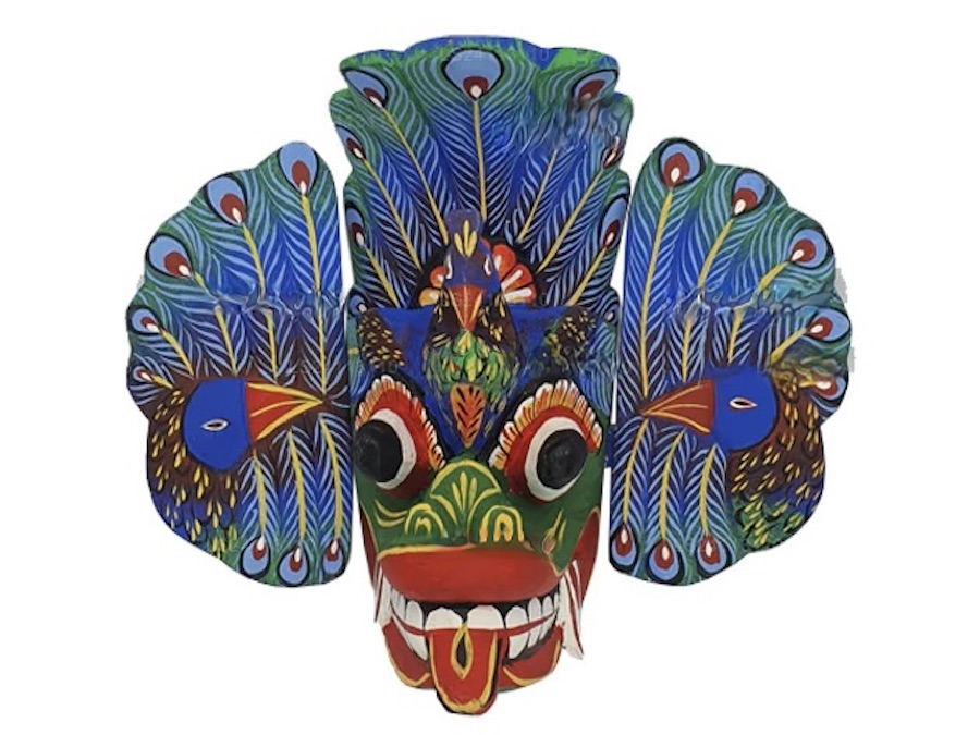 The Mayuri Raksha masks represent three beautiful peacocks. They bring peace, wealth and prosperity to a house or business, at the same time they ward off evil spirits. Normally painted in shades of blue. The are often used in ancient forms of dancing.