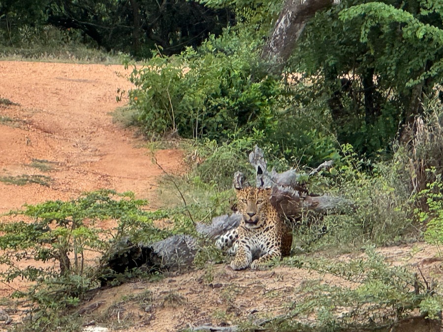 Suddenly the driver stopped the vehicle, peering into the scrub he whispered “a leopard is walking in there”. Tantalising glimpses of spotted fur moving through the bushes then the leopard calmly appeared and walked down the road in front of us for a little way before disappearing back into the forest.